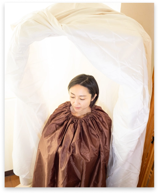 専用の椅子に座り、下から立ち上る蒸気を、デリケートゾーンから直接取り込みます。よもぎを中心とした漢方の成分が、粘膜吸収によって体の奥深くまで届く、とても効率的な温活法です。